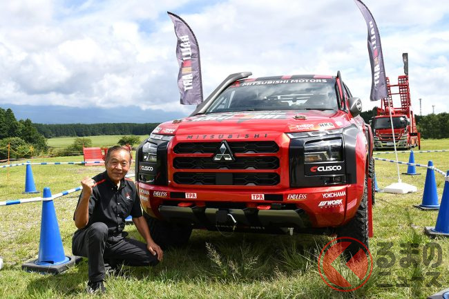 その会場近くに展示されていたのは、2025年8月に開催されたアジアクロスカントリーラリー2025で見事3年ぶりに総合優勝した「チーム三菱ラリーアート」のトライトンの競技車両です。パリダカールラリーを2度制覇し、現在はチーム三菱ラリーアート総監督の増岡浩氏も会場に駆けつけており、王者奪還の喜びのコメントがありました。