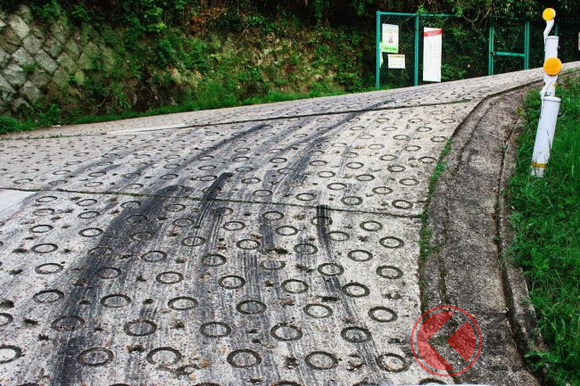 最大こう配の斜度は約40度とも言われ、カーブの内側にはクルマが登れなくてスリップしたのか、多数のタイヤ痕が目立っています。