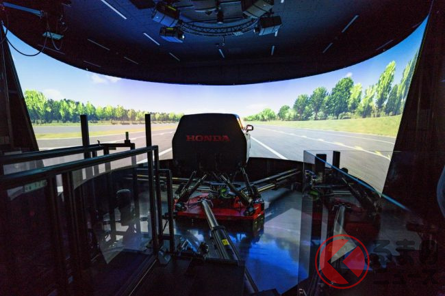 次に見学したのは、四輪ダイナミクス性能評価用のドライビングシミュレーター。この装置は、アクチュエーター部分を鷺宮製作所が開発し、システム全体をイタリアのVI-grade社製をベースにホンダが独自にカスタマイズした高性能ドライビングシミュレーターです。