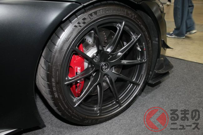 エクステリアは、カーボンファイバー製のリアスポイラーや拡大されたフロントエアスパッツ、新設されたホイールアーチフラップが特徴です。足元には、GRロゴ入りのレッドキャリパーを備えた19インチのマットブラック塗装アルミホイールを装着。