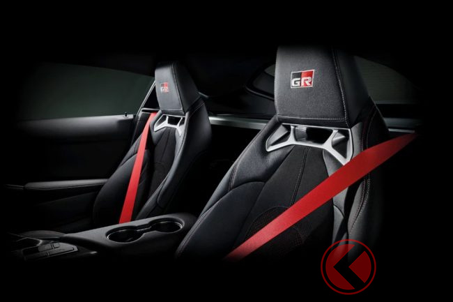 インテリアはブラック基調で、ヘッドレストにGRロゴが刺繍されたアルカンターラ製シートや、スポーティなレッドのシートベルトが採用されています。
