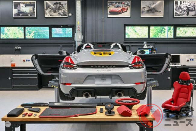 ボディは専用色「サンテネール・シルバー」で彩られ、足もとには「20インチ鍛造マグネシウム製718ケイマンGT4 RSホイール」を装着。車体後部とサイドに刻まれたイエローの「55」エンブレムは、1954年に勝利を収めた550スパイダーのゼッケンを彷彿とさせます。