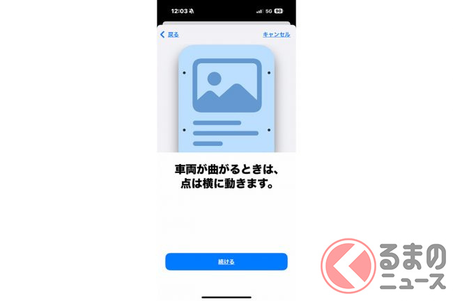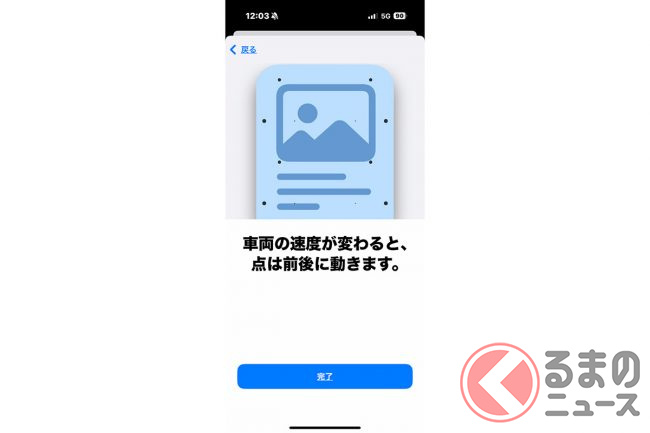 車両モーションキューは、画面の端にアニメーションのドットとして表示され、「iPhone」の操作の邪魔になることなく車両の動きを表現します。