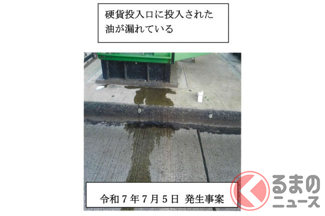 さらに7月5日の15時50分ころ、今度は下り線の料金徴収機器の硬貨投入口に、なにかの油が投入。リリースには当時の写真がありますが、硬貨投入口どころか、機器の下まで油が染みており、かなり大量に投入されたものとみられます。