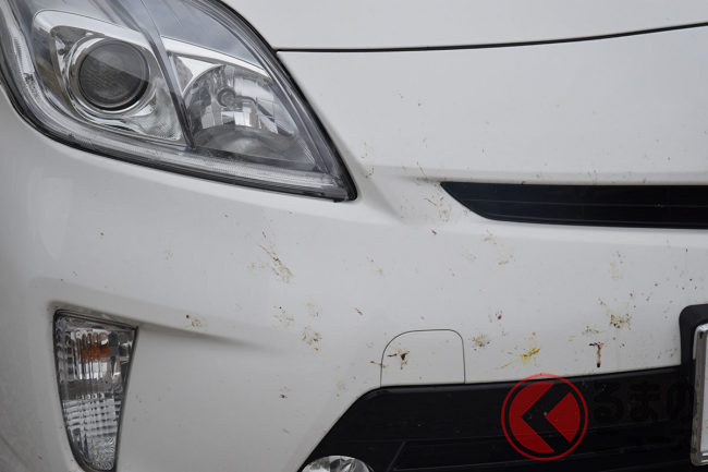 走行後の塗装面に付着した虫の死骸は、早期に除去しないと酸性体液が塗装を侵し、焼き付きシミになります。