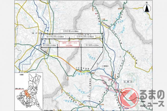 桜川市と石岡市を結ぶ上曽トンネルの整備区間は、桜川市側が2.63km、石岡市側が2.95kmという内訳で、桜川市区間においては、1599mがトンネル部分として整備されてきました。