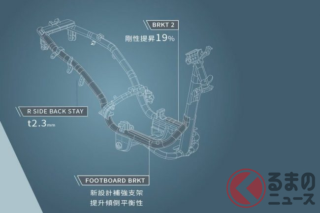 車体には剛性を15%から19%向上させた新型フレームが用いられており、軽快な走行性を実現するため、フロントホイールとタイヤのナロー化やボディのスリム化が図られ、デザインにはエアロダイナミクスが駆使されています。