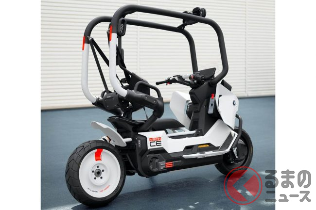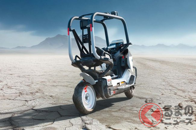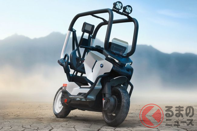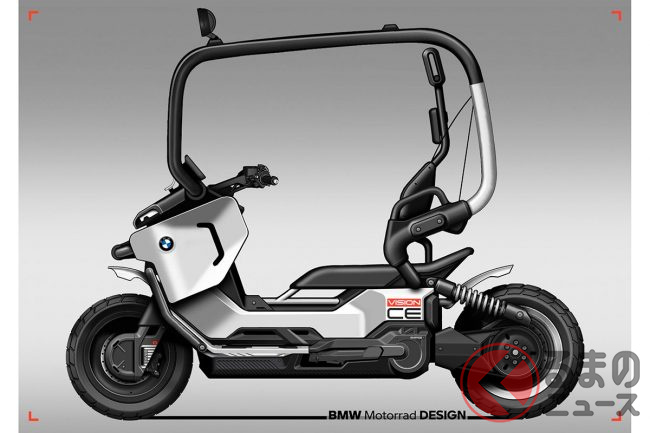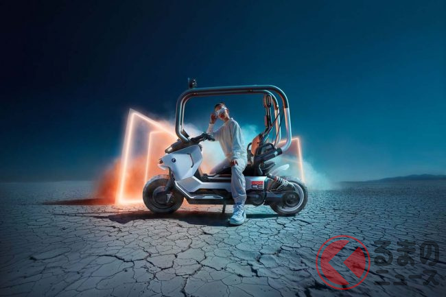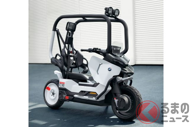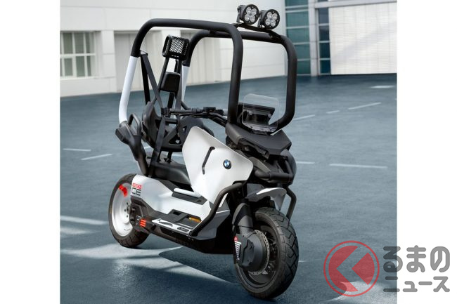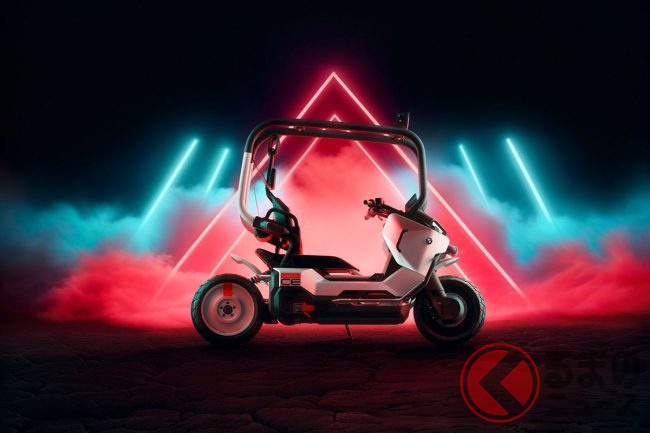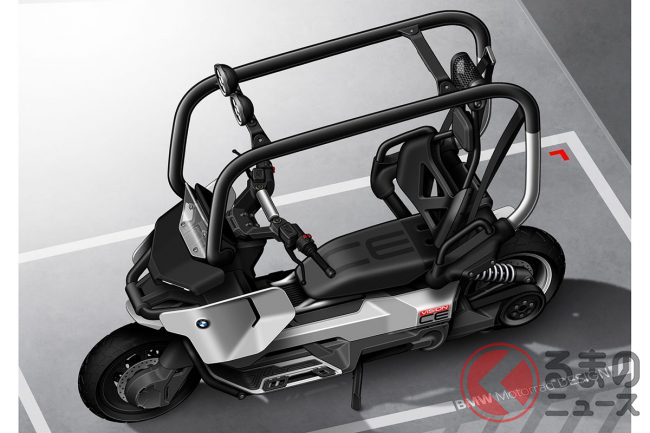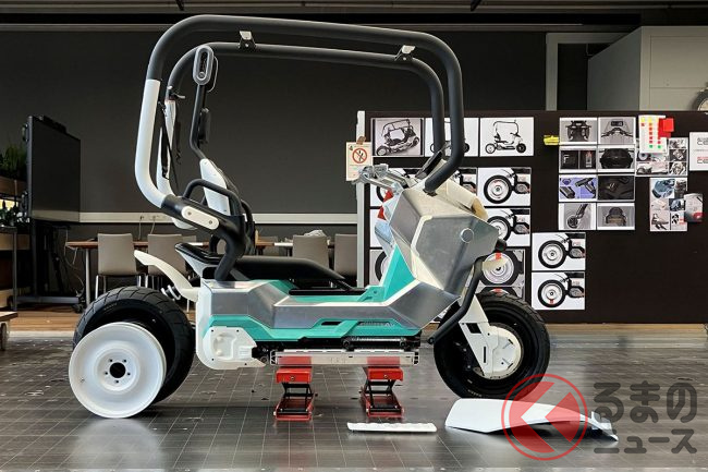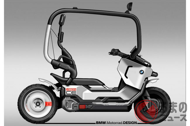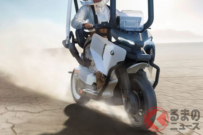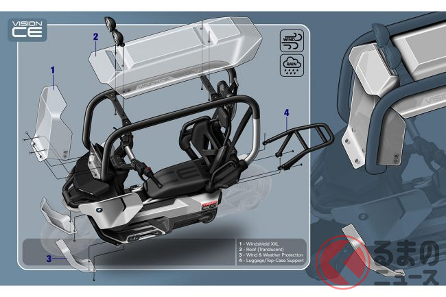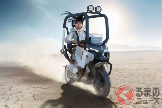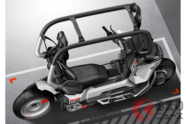 BMWが「ノーヘルで乗れるバイク」を初公開! まるでホンダ「ジャイロキャノピー」な“ケージ構造”×自立機能も搭載! 画期的な新コンセプトモデル「Vision CE」発表