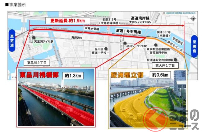 羽田線(東品川桟橋・鮫洲埋立部)の約1.9kmは、長期的な耐久性や将来の維持管理性を確保するため、「首都高リニューアルプロジェクト」として、2016年から更新(造り替え)に着手してきました。