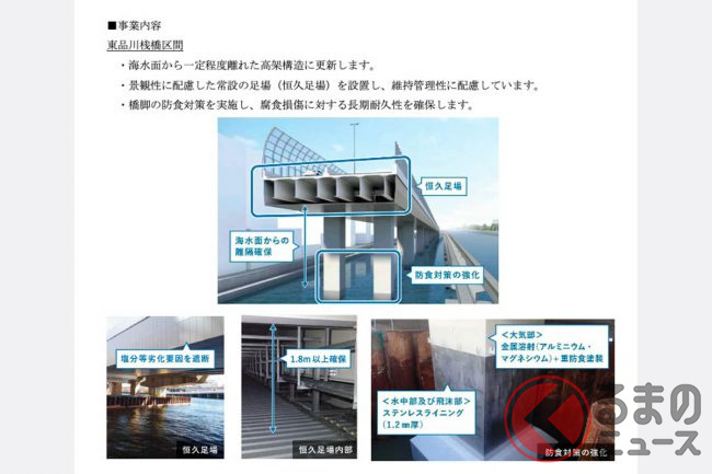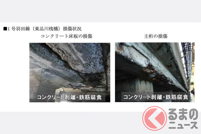 これまで、日々、点検・補修が行われてきましたが、1日平均約7万台という過酷な使用状況、京浜運河内の海水面と高速道路構造物が極めて近いなど、激しい腐食環境があり、コンクリートの剥離や鉄筋の腐食等の損傷が多数発生。