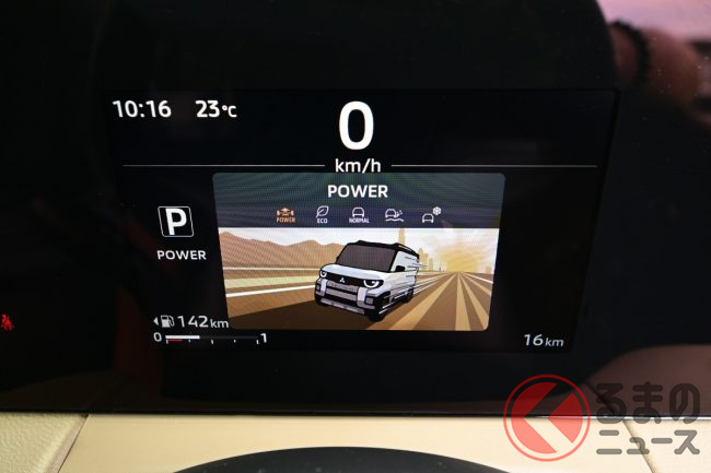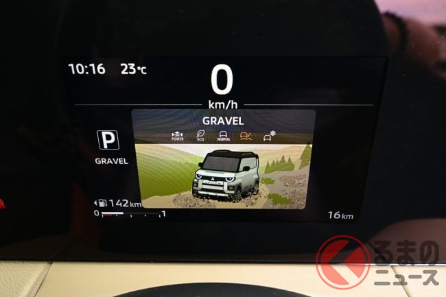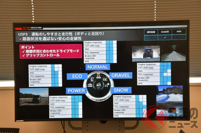ーー その1つが悪路走行をサポートするデリカミニ “専用”のドライブモードセレクトです。ドライブモード自体は日産「ルークス」にも採用されていますが、デリカミニの4WDモデルには5つのモードが設定されています。