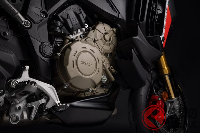 最高出力180馬力(132.4kW)/12,250rpm、最大トルク118Nm(12kgm)/9,500rpmを発揮するこのエンジンは、デスモドロミックバルブ機構により広範な出力特性を持ち合わせています。低回転域から中回転域では滑らかなレスポンスを、高回転域ではスポーティな特性に仕上げられています。