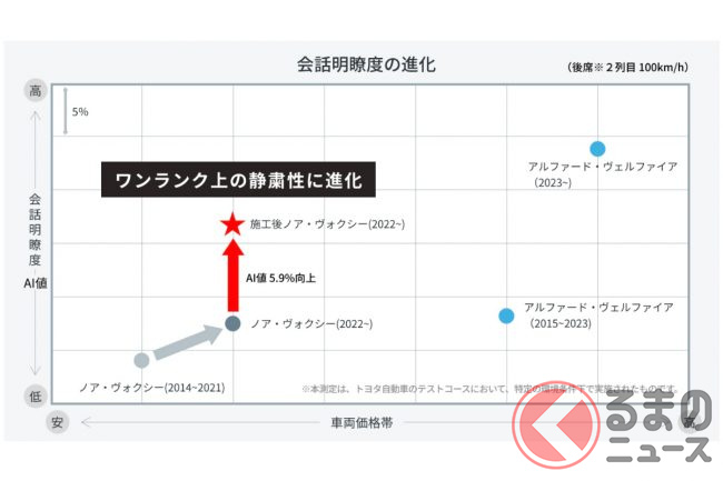 そのため、本アイテムをまずはファミリー層のユーザーが多いノア/ヴォクシーに設定。より家族の会話が弾む静かな移動空間への進化を目指し、リヤ席に特化して静粛性を向上させた結果、リヤ席のAI値が5.9%向上したといいます。