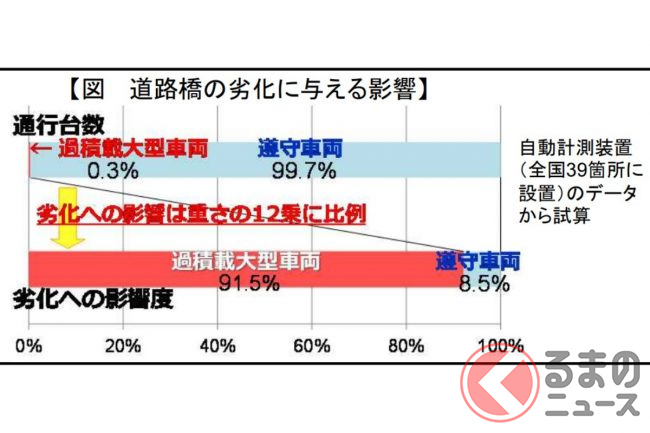 そして、過積載車が通行することで、道路の舗装や橋脚、高架などの構造物にもダメージを与えます。補修のための道路工事を行い、不便を強いられるとともに、本来は必要なかった道路修理で、貴重な税金が投入されます。