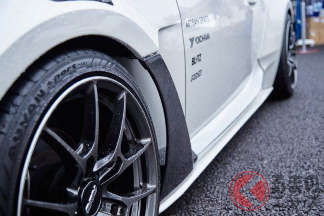 特に際立っているのが、ワイド化された前後フェンダーです。装着されているGT WIDE BODY KITは、フロントが30mm、リアが50mmもワイド化されており、まるでGTカーのような迫力があります。