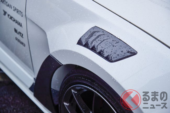 サイドに目を向けると、ワイドフェンダー後方からはタイヤが見えるようなデザインで、タイヤハウスから空気を抜くことを考慮しながらも、立体的でレーシーに仕立てられています。