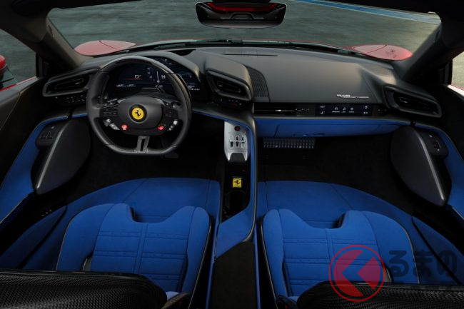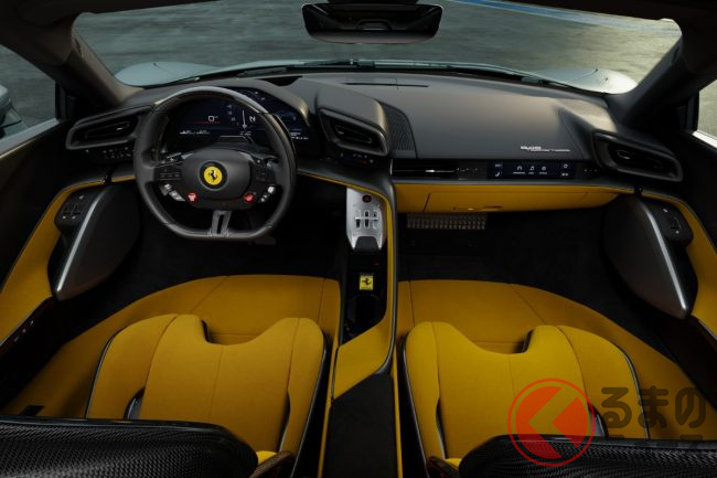 インテリアには最新のHMI(ヒューマン・マシン・インターフェース)が導入され、デジタルディスプレイとステアリングを中心に操作系を集約。クラシカルな要素を盛り込みながらも最新技術を融合し、フェラーリらしいドライバーオリエンテッドな空間が広がります。
