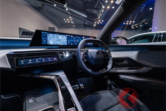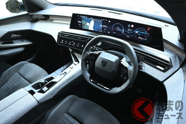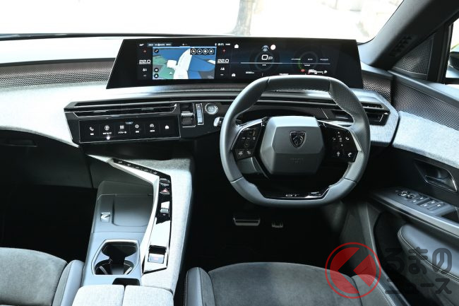 最新モデルで目を惹くプジョー新型「3008」のコクピットは、タッチスクリーンとハードスイッチをバランス良く残しつつ、ほかのモデルでは見ない個性的なデザインを提供しています。
