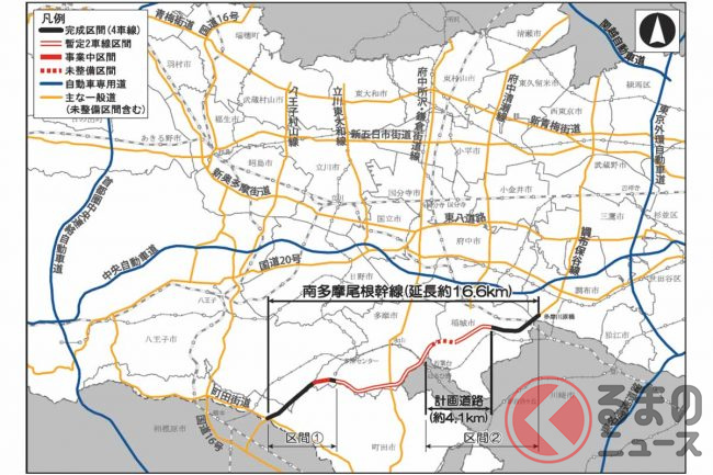 多摩ニュータウンのエリアは、並行する「南多摩尾根幹線道路(通称:尾根幹)」を含め、多摩川を渡って府中、調布などの都内方面に向かう幹線道路はいくつもありますが、南側の相模原や16号方面へは、いずれも町田街道で完全に分断。