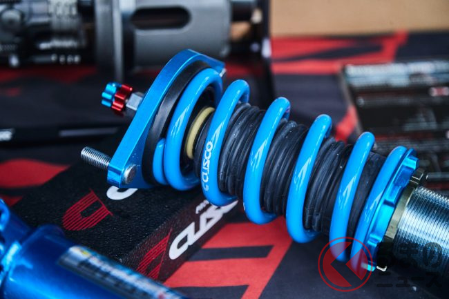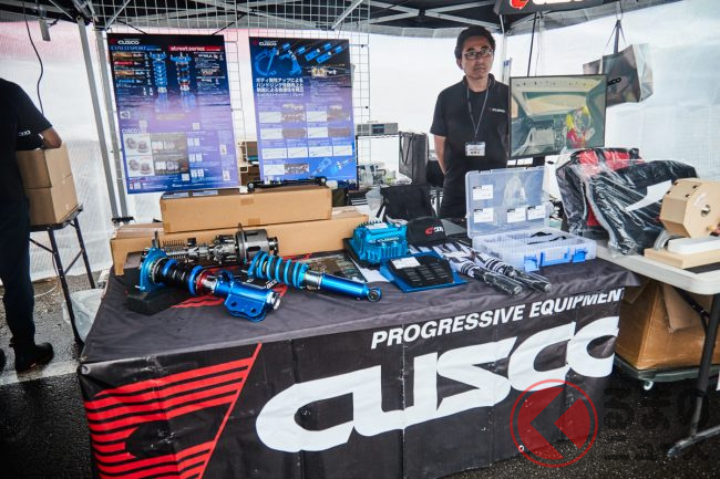 まず1ブース目、車高調(車高調整式サスペンション)やボディ補強パーツ、LSDなど走りに関するありとあらゆるパーツをそろえているのが、キャロッセ(群馬県高崎市)の「CUSCO(クスコ)」です。