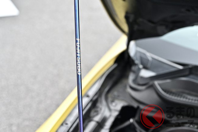 純正でも、ボンネットを開けた際に支えるボンネットステーが装着されています。純正では何の変哲もないただの黒い棒ですが、それをマフラーと同じ焼き色が入り、「FUJITSUBO」のロゴ入りになるだけで、オフ会などでボンネットを開けて見せたくなるほどの満足感があります。