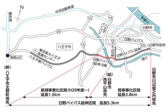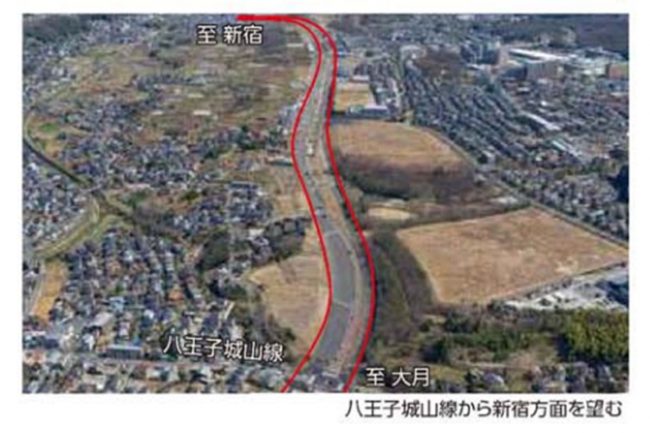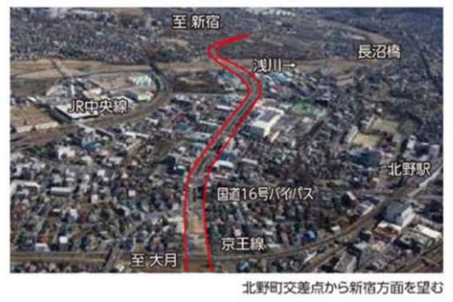 この新ルートは、中央線の南側を通るかたちで現道とは全く違う経路をたどり、さらに京王線の北野駅付近で「八王子南バイパス」(9.6km)と直結。現道の南を並走する形で圏央道「高尾山IC」までを結びます。