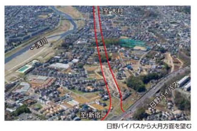 さて、この日野バイパスですが、中央線をまたぐ跨線橋の手前、「坂下」交差点付近から南西に逸れる新ルートが延伸開通する予定で、事業が進んでいます。