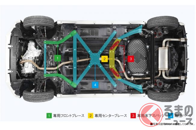 さらに、フロントに床下には専用ブレースを配して剛性強化を実施し、センターブレースの形状も変更してスパッツを追加するなど、体幹の強化も図っています。