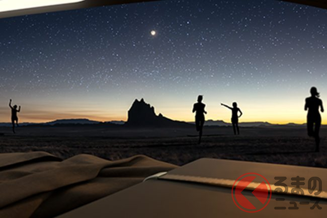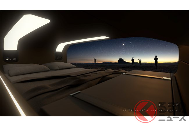 三菱「謎の車内空間」初公開! 大人2人が寝られる「めちゃ広ッ車内」&開放感スゴイ“大きなウインドウ”! 次世代モデルを示唆? 「ジャパンモビリティショー2025」出展を発表!