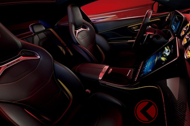 インテリアもダークカラーを基調にイエローアクセントで統一。ヘッドレスト一体型のAMGパフォーマンスシートにはイエローステッチ入りナッパレザーを採用し、シートベルトもイエローでコーディネートされています。