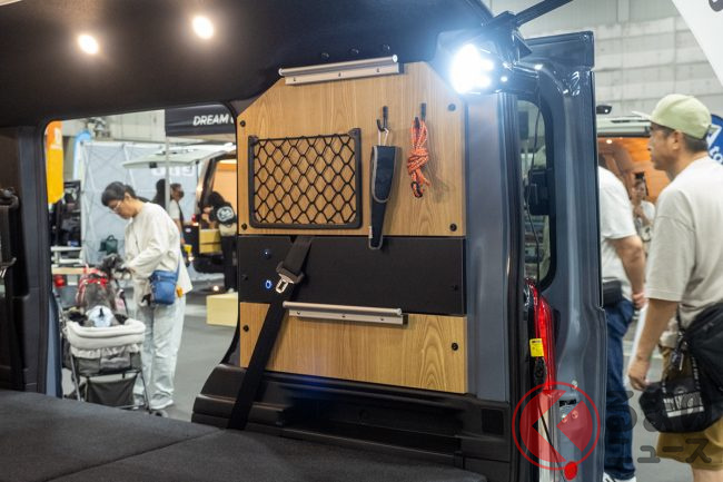 天井には断熱処理を標準施工し、さらに6つのスポットライトに加え、首振りスポットライトを左右に装備します。収納ボックスは積載量が豊富で、多くのキャンプ用品を収納できる機能的なつくりとなっていました。