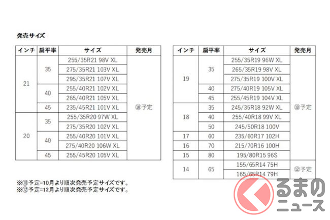 新たに発売されるのは14インチが2種類、15インチから17インチが1種類ずつ、18インチが3種類、19インチと20インチが各5種類、21インチが6種類の計24サイズ。これにより同シリーズは全100サイズとなり、軽自動車からコンパクトカー、セダン、SUV、ミニバン、スポーツカーまで幅広い車種をカバーします。