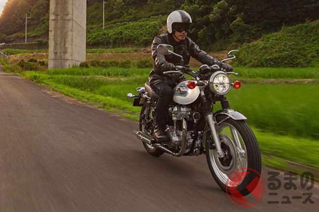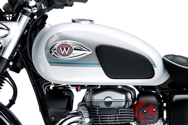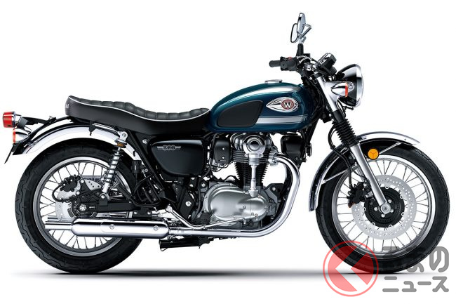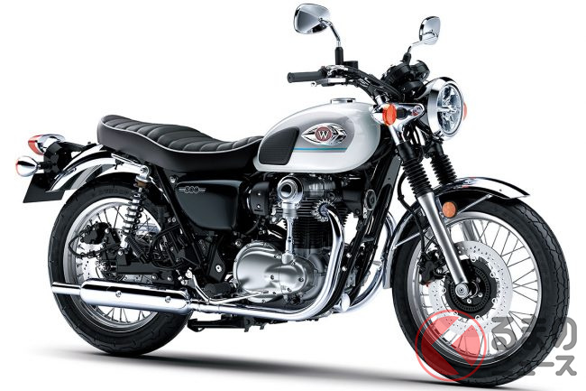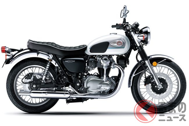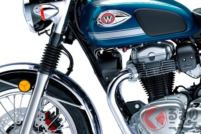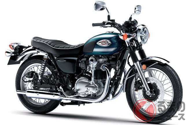 カワサキ新「大型レトロバイク」発表! “旧車感”スゴイ丸目の「昭和風デザイン」採用! 直立した「2気筒エンジン」搭載した“W800”は新カラーとグラフィックが美しい!