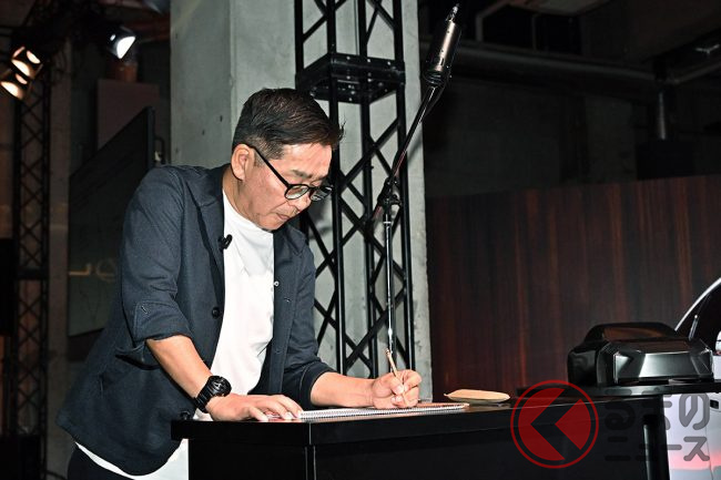 レクサスは2025年10月1日、新型「ES」を日本初公開しました。その公開イベント「SENSES ―五感で感じるLEXUS体験」では、視覚のコンテンツとしてチーフデザイナーの熊井弥彦氏によるスケッチ解説が行われました。