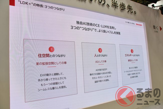 「LDK+」は2024年9月に行われた「SHARP Tech-Day’24」にて発表。車内を「リビングルームの拡張空間」として捉え、「ユーザーの自宅の3LDKが4LDKに、4LDKが5LDKになるようなシームレスな居住体験を提供する」とのことです。