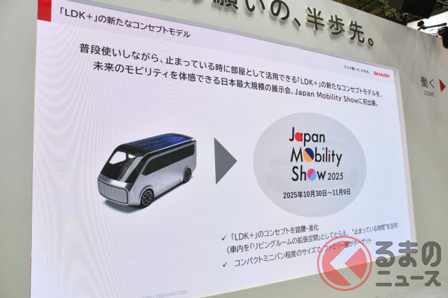 シャープ(堺市)が、2025年10月30日~11月9日に東京ビッグサイト(東京都江東区)で開催される「JAPAN MOBILITY SHOW 2025」に出展します。目玉は、EVを「走るリビング」にするという「LDK+(プラス)」の公道走行可能モデルです。