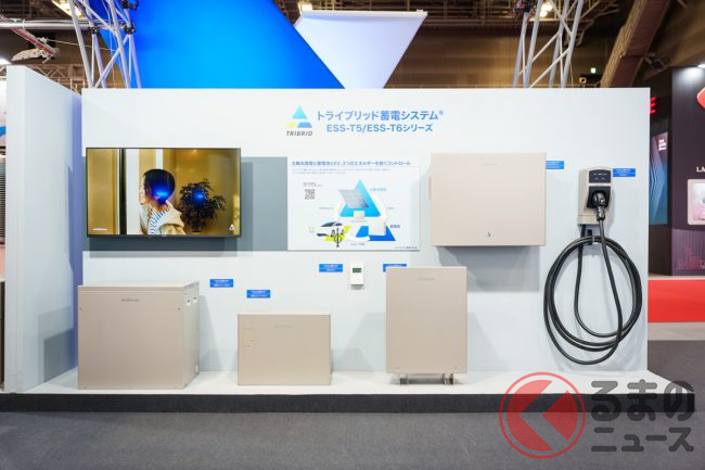 一般的なベーシックタイプ(家庭のソーラーパネルで発電した電気を車両へ送り、停電時には車両の電気を家庭へ送る)のV2Hユニットに加え、家庭用蓄電池を組み合わせたユニットも展示されています。