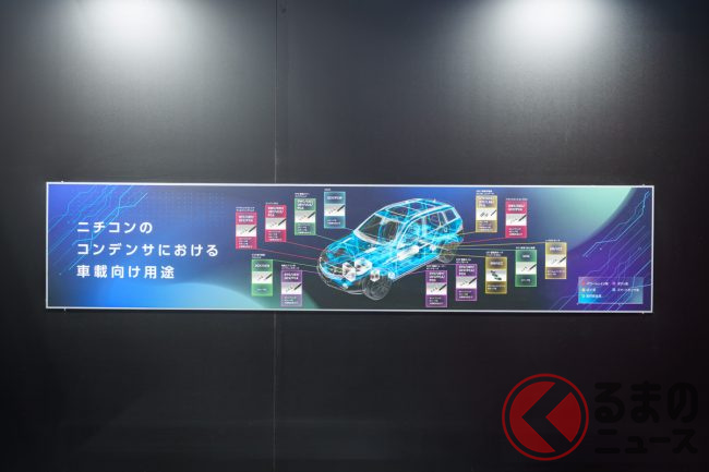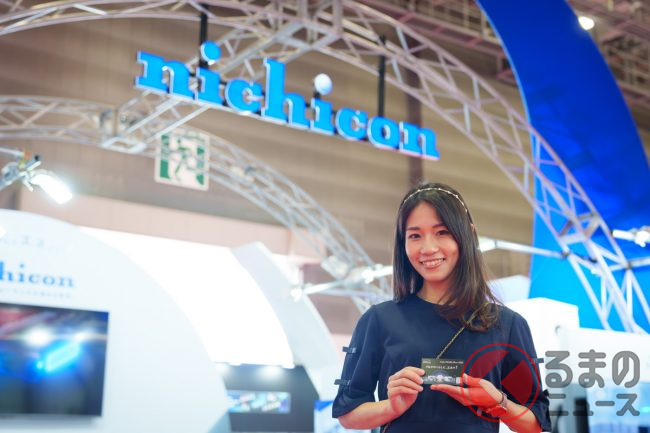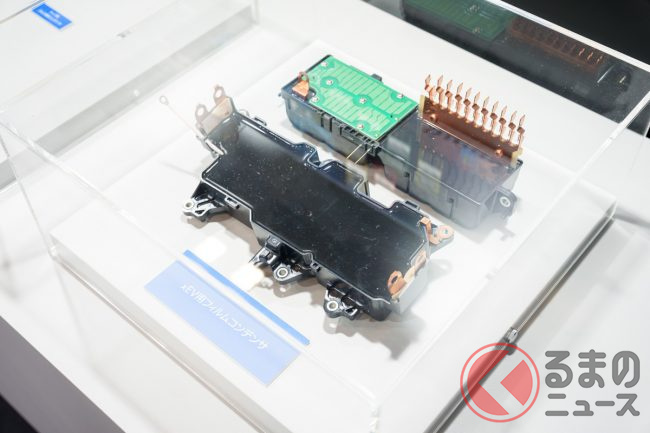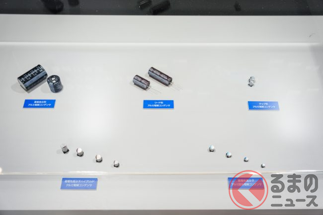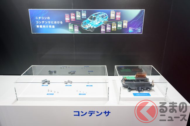 しかし、実際にコンデンサを見たことがある人は多くないでしょう。ニチコンブースには、ハイブリッド車やEVなど多くのクルマに実際に使われているコンデンサが展示されています。