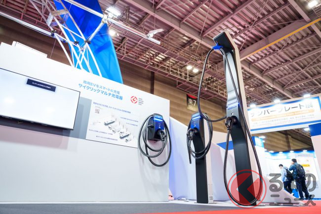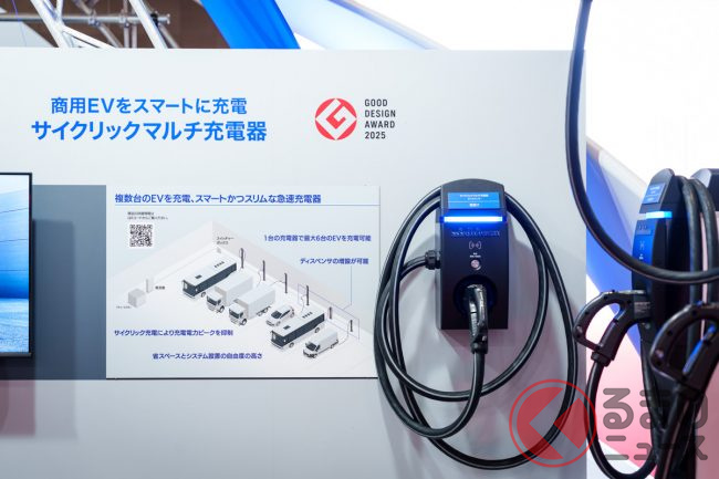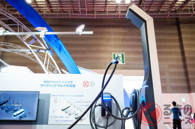 加えて、バスの車庫といった狭い場所で、ひとつの急速充電器から複数の車両へ電気を供給するユニットなども展示されています。