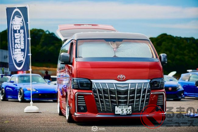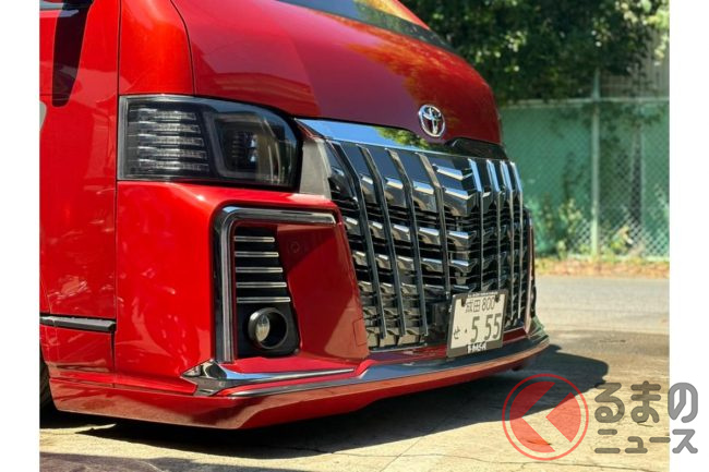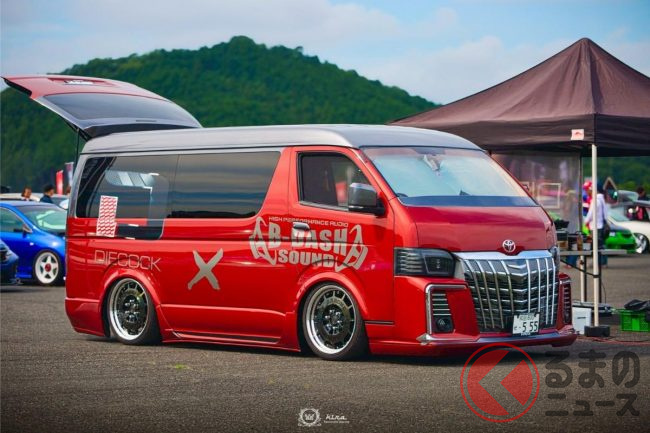 トヨタ「ハイエース」のフロントマスクを、同社の「アルファード」風にカスタムしたクルマが全国各地の自動車関係のイベントブースに登場しているようです。