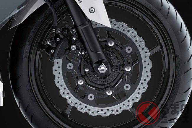 優れた動力性能を支えるため、足回りには41mmの大径フロントフォークやラジアルタイヤなどが備わっています。