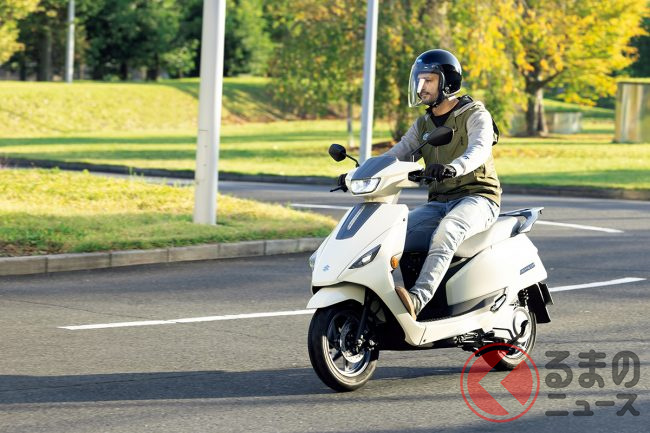 スズキが人気モデル「アドレス」の快適仕様を日本初公開! 排気ガス出ないエコモデル!? シート下には収納スペース完備! 「e-Address」をJMS2025に展示