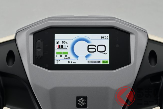 4.2インチのフルカラークラスターと専用アプリ「Suzuki Ride Connect-E」により、スマートフォンと連携することができます。