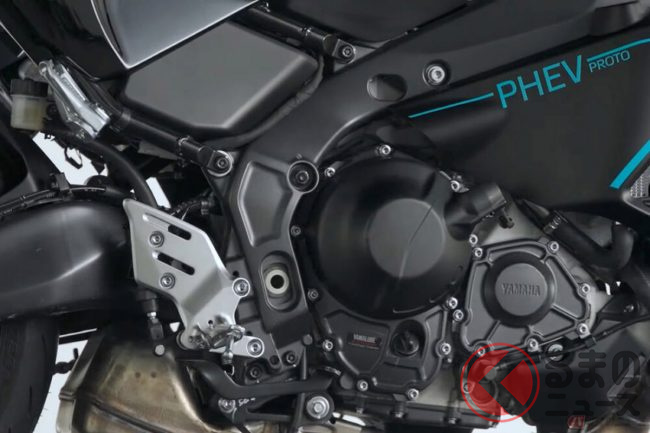 ヤマハが「新ハイブリッドバイク」発表!? すでに走行実験も行っている「PROTO PHEV」をJMS2025で披露 状況に応じて走行システムを変更可能な一台とは?