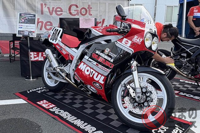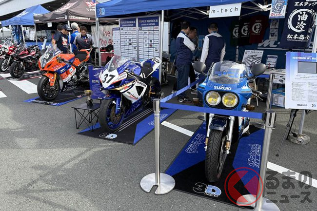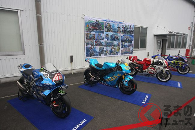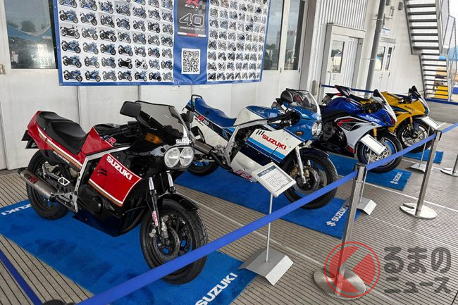 「GSX-R」シリーズの原点といえる「GSX-R(400)」(1984年)やグローバルモデルの第一弾となる「GSX-R750」(1985年)といった歴代モデルやレース使用車両も出展されました。