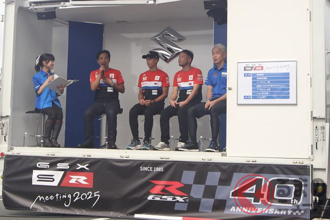 イベントで開会宣言を担当した鈴木俊宏社長は、「今年はGSX-Rの40周年記念を兼ねて開催となりました。台風23号の影響が心配されますけど、本当に多くの皆さんに来場いただき、本当にありがとうございます」と挨拶。