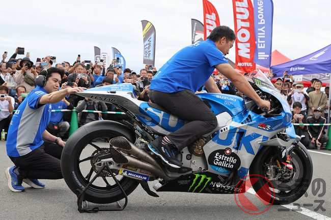 イベント中には、鈴鹿8耐に参戦した「ヨシムラ SERT Motul」、「チームスズキCN チャレンジ」のほか、GSX-Rシリーズと関係の深い北川圭一さんと開発陣によるGSX-R 40周年トークショーも実施。さらに、MotoGP参戦中に使用されていたマシン「GSX-RR」のエンジン始動もサプライズ企画として用意されました。