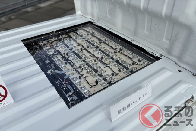 基本的にはガソリン車のキャリイをEVへコンバージョンしたもので、パートナー企業であるエリーパワーさんが開発した住宅用蓄電リチウムイオンバッテリーをそのまま搭載できるようにしています。