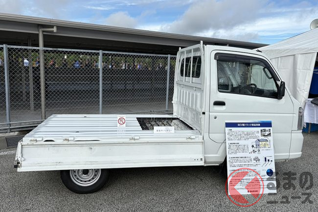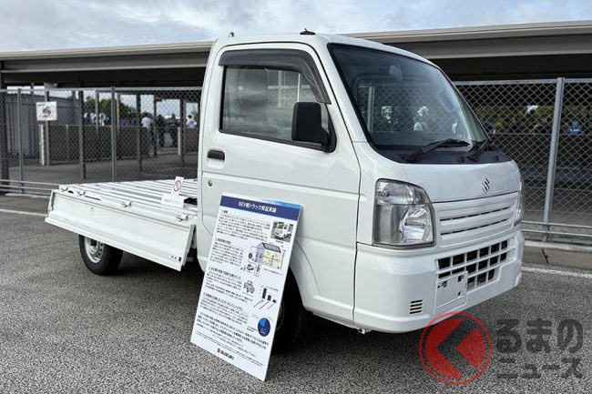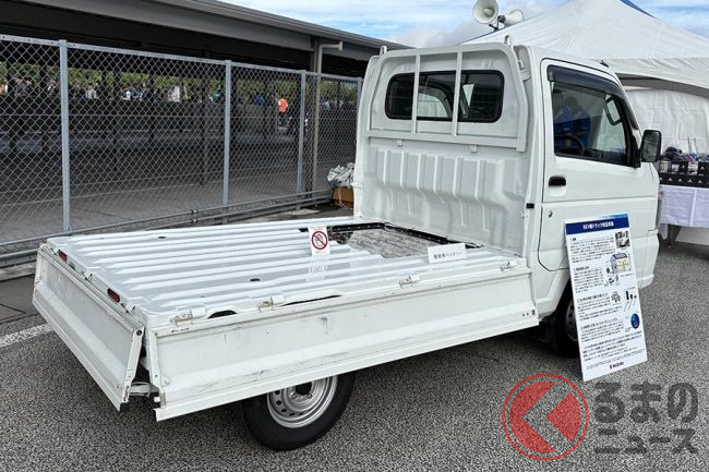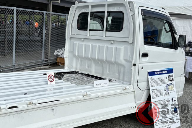 スズキは2025年10月12日、浜松工場内の特設会場で催されたユーザー参加型イベント「GSX-S/R Meeting 2025」において、BEV(バッテリー電気自動車)仕様の軽トラック「キャリイ」(以下、電動キャリイ)の展示を行いました。どのような車両なのでしょうか。