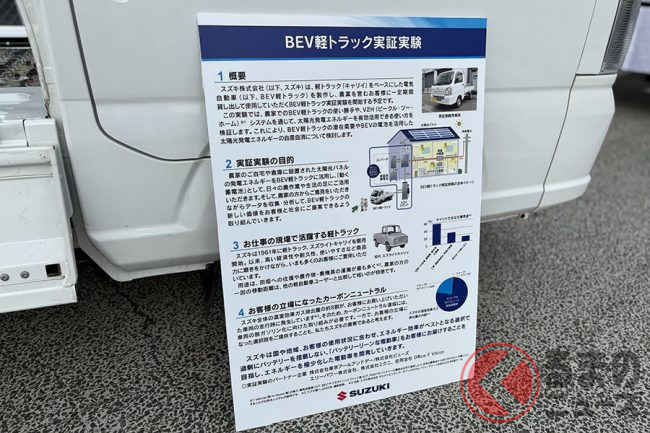 スズキはこの実証実験を通して、BEVキャリイの潜在的な需要や、BEVの電池を利用した太陽光発電エネルギーの自産自消について確かめ、国や地域、使用者の状況に応じた最適なエネルギー効率で、過剰にバッテリーを搭載しない「バッテリーリーンな電動車」の実現に向けて、パートナー企業と開発を進めていくと発表しています。